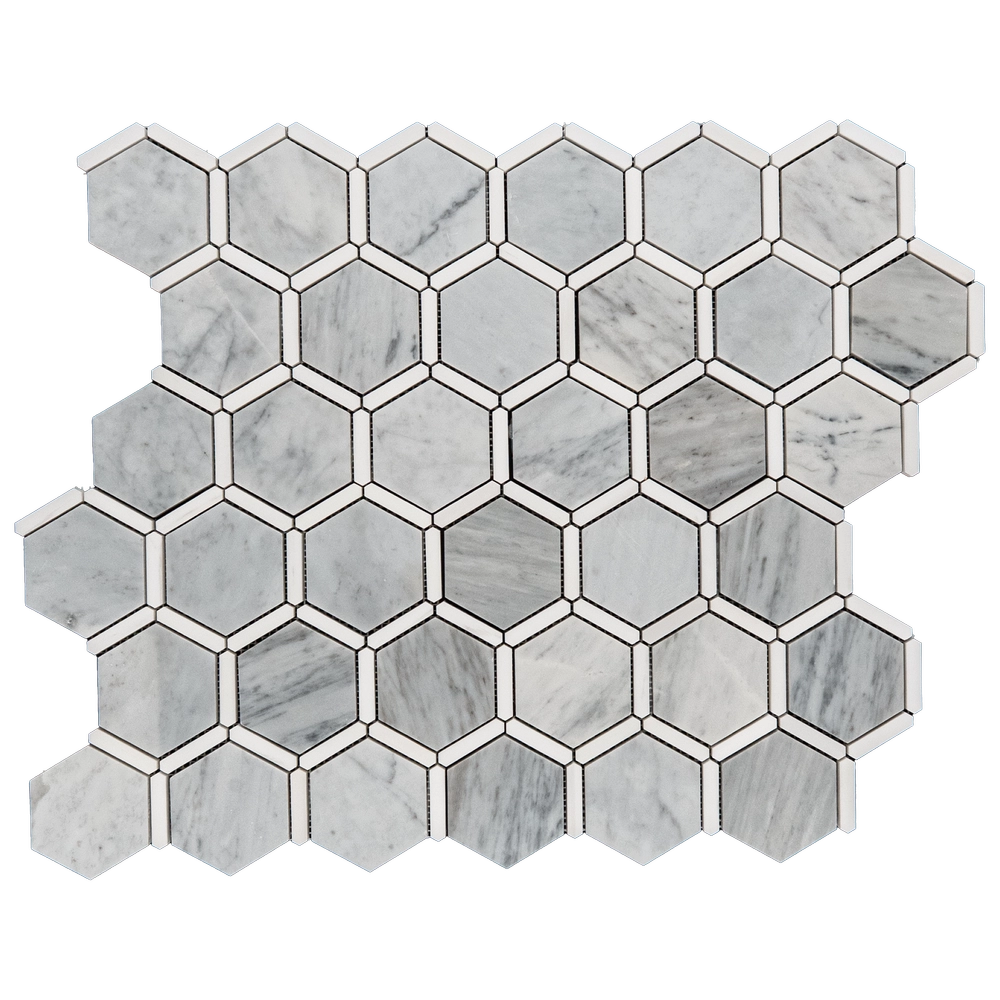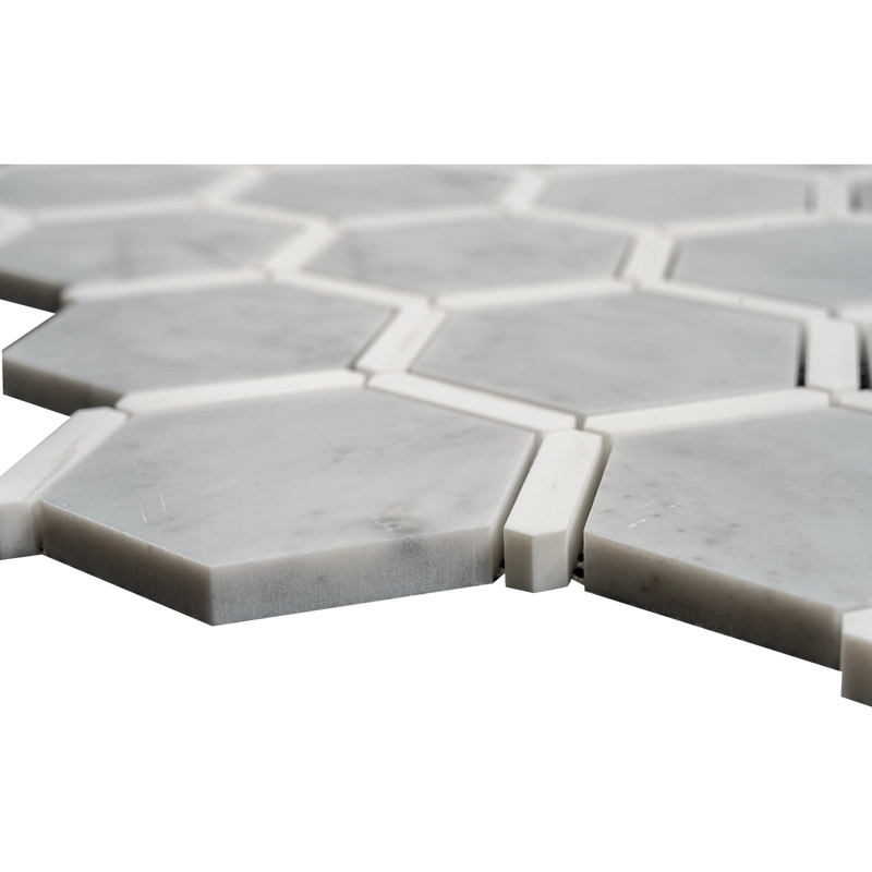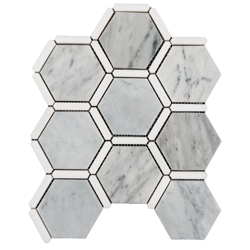 This mosaic combines two premium marbles: Carrara (soft gray-veined white) and Dolomite (crisp white), both polished for a luminous finish. Sheets are mesh-mounted (~12″×12″) with factory chip spacing; some lots may be paper-faced. Suitable for walls, backsplashes, shower surrounds, and light-traffic residential floors. Polished surfaces can be slippery when wet.