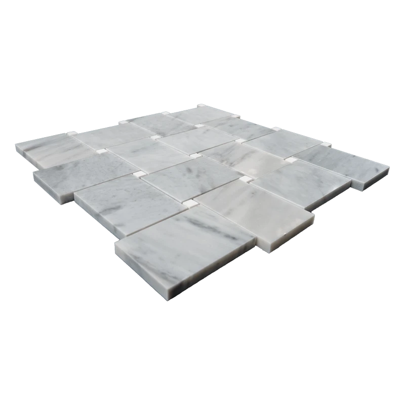 Bring timeless luxury into your space with the Large Basket Weave Carrara & Dolomite Marble Mosaic. Each 12″ x 12″ sheet features a bold interlocking weave, blending the clean tones of Carrara White with the soft gray shades of Dolomite. The polished finish enhances the marble’s natural veining, creating depth and a refined glossy look.