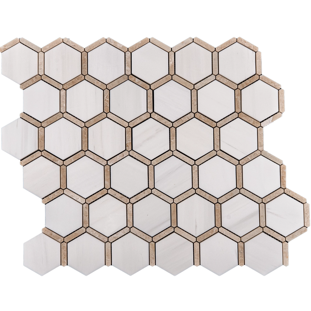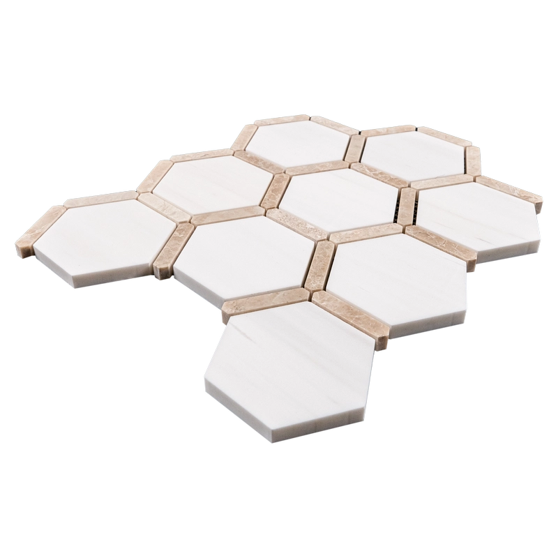 This mosaic features a harmonious two-stone blend: crisp Dolomite (white) and warm Royal Beige marble, both polished to a smooth, reflective finish. Sheets are mesh-mounted (~12″x12″) with factory chip spacing. Suitable for walls, backsplashes, shower surrounds, and light-traffic residential floors. Polished stone may be slippery when wet.