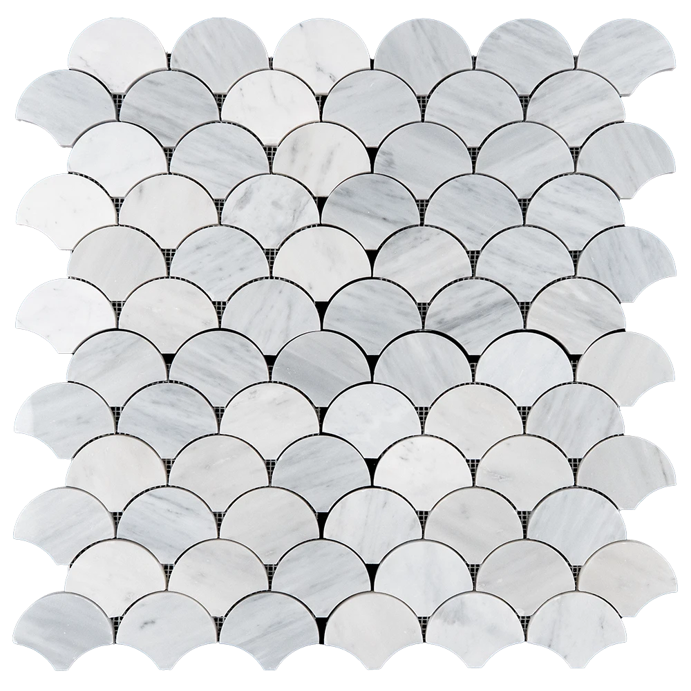 Fish Scale Carrara White Marble Mosaic Tile – Polished Finish (10.4″ x 27.8″)