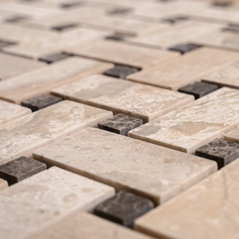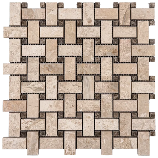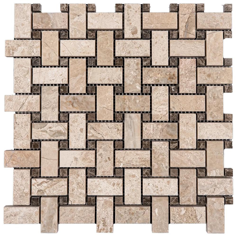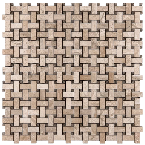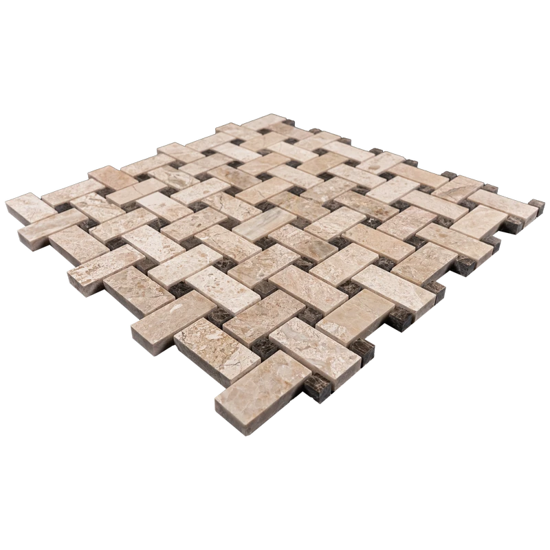 Elevate your interiors with the Basket Weave Royal Beige & Emperador Marble Mosaic. Each 12″ x 12″ polished sheet showcases a sophisticated basket weave pattern, blending warm Royal Beige hues with rich Emperador marble accents. This combination adds depth, texture, and a touch of luxury to kitchens, bathrooms, and feature walls.