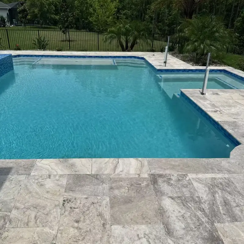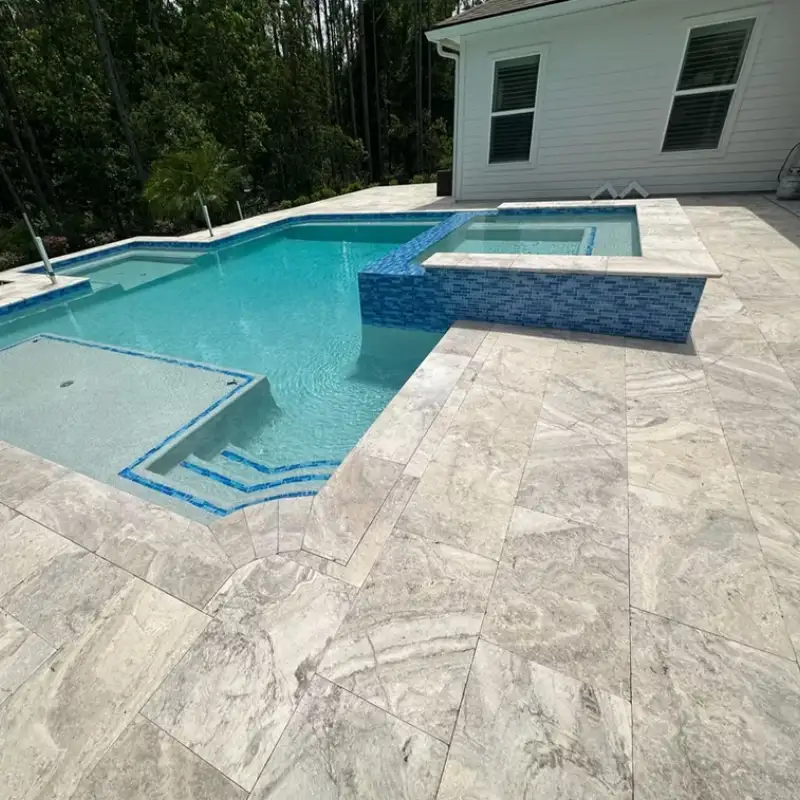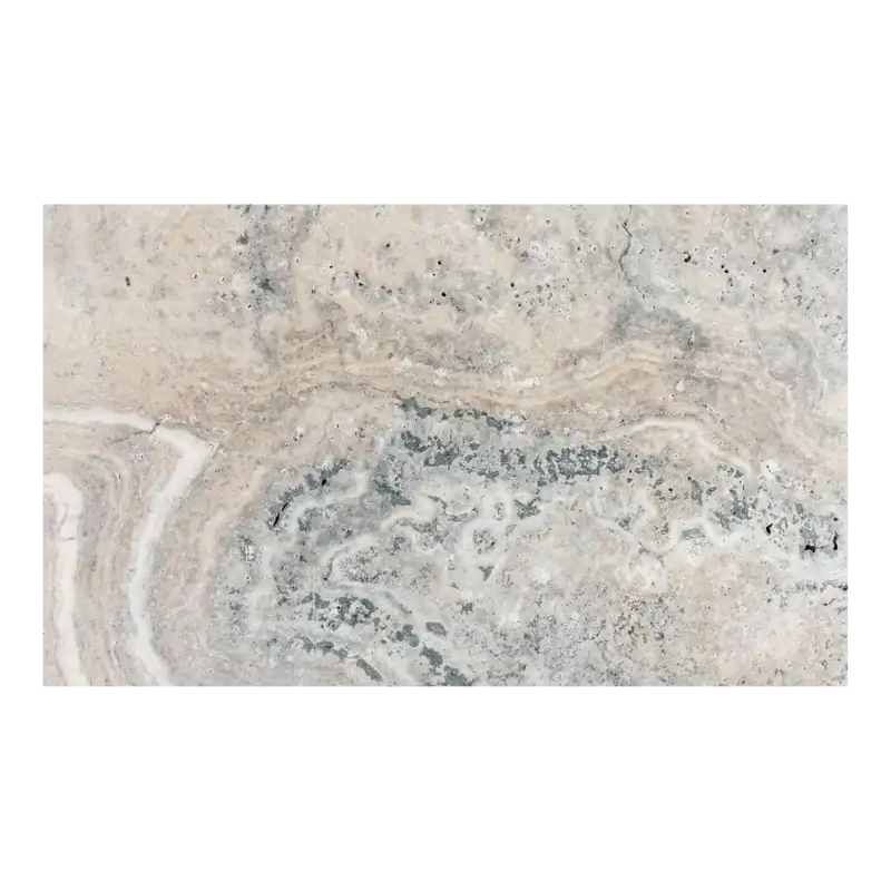 Tumbled travertine in a timeless French pattern. Alaska Silver features soft gray-beige tones with natural variation—ideal for patios, pool decks, and rustic interiors.