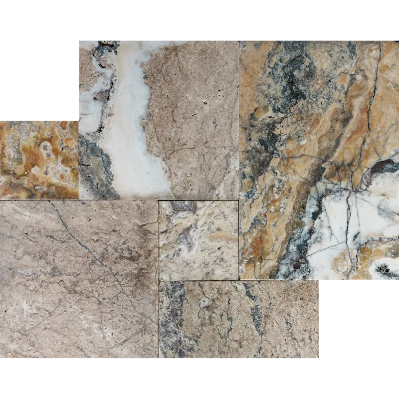 Elevate your indoor or outdoor spaces with the Anthic Onyx tumbled travertine set, designed with a classic French pattern. Each tile showcases rich color variation—from gold and cream to silver and charcoal—enhanced by bold natural veining that adds depth and character to any installation.
