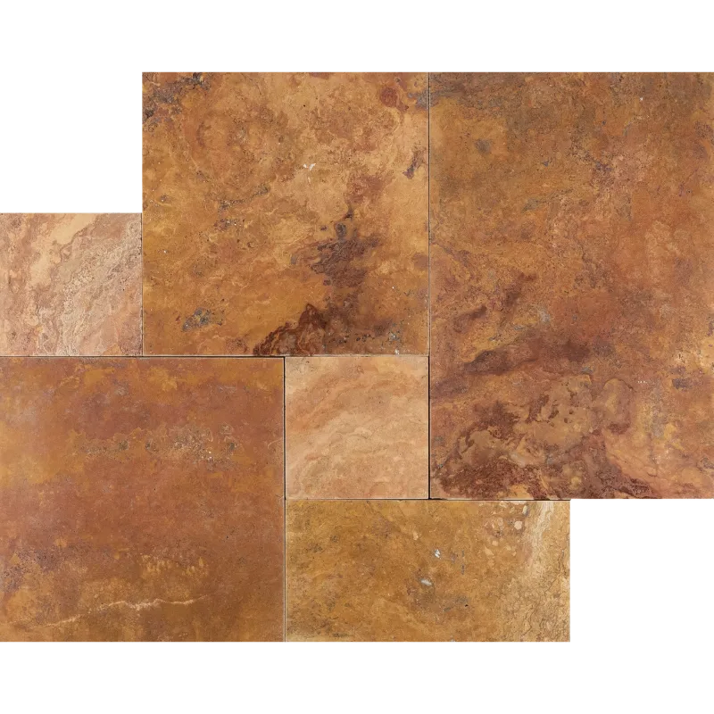 Peach Blend – French Pattern Tumbled Travertine Pavers bring warm, sun-kissed tones to any space. Featuring a harmonious mix of peach, burnt orange, golden yellow, and soft copper hues, each natural stone piece displays unique swirls and veining for authentic character.